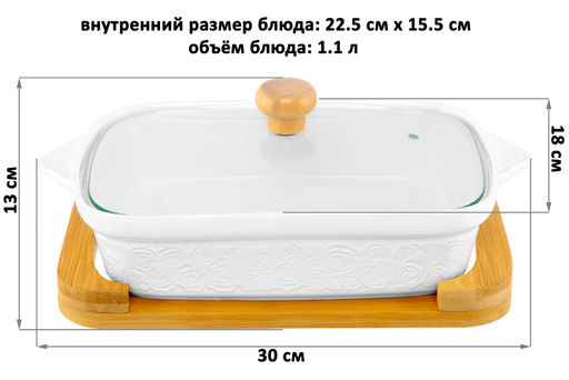Блюдо д/зап и серв 30*18*13 см 1,1 л "Розы" прямоуг + стекл крышка на дер подставке