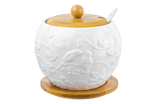 Сахарница 620 мл 12*12*12 см "Птички на ветке" + ложка + дер. крышка на дер. подставке