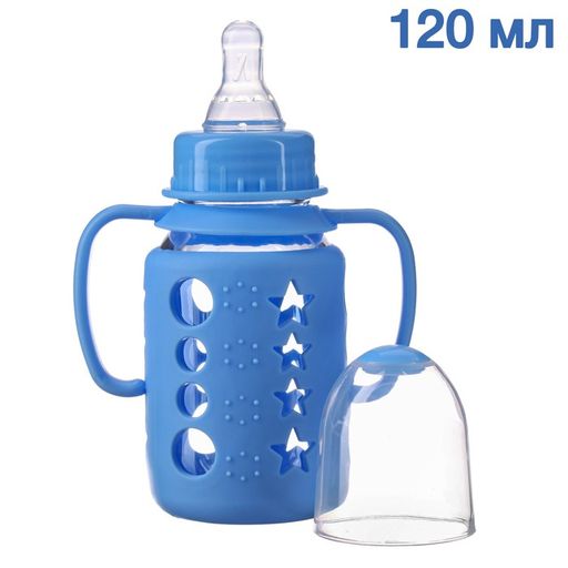 Бутылочка в силиконовом чехле, с ручками, стекло, классическое горло, 120 мл., +0 мес, цвет голубой