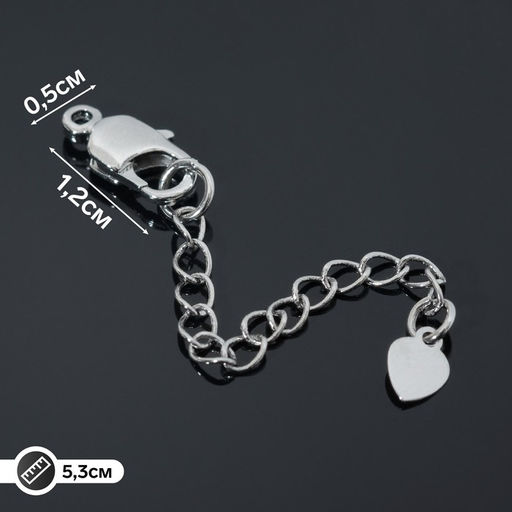 Замок-карабин родированный 1,2х0,5см "Сердечко" с удлинителем 5,3см, цвет серебро