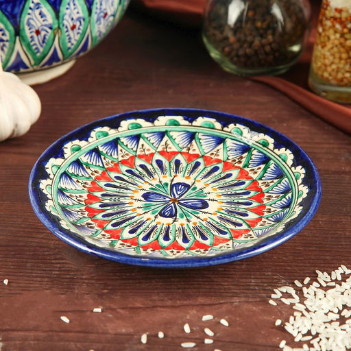 Тарелка Риштанская Керамика "Цветы", синяя, плоская, 15 см