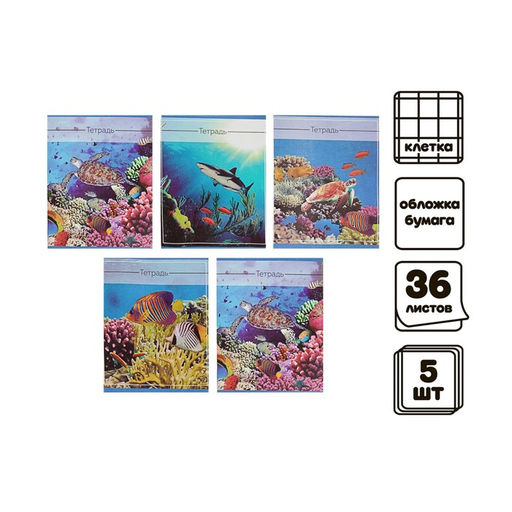 Комплект тетрадей из 5 шт (4 разные + 1 повторяющаяся МИКС), 36 листов, клетка, Океан, обложка мелованная бумага, блок №2, белизна 75% (серые листы)