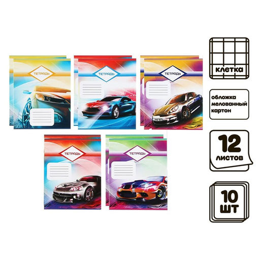 Комплект тетрадей из 10 штук Calligrata "Тачки", 12 листов в клетку, обложка мелованный картон, ВД-лак, блок офсет, белизна 95%, 5 видов по 2 штуки