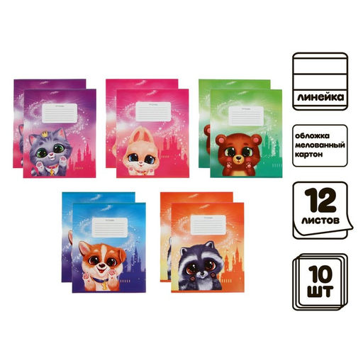 Комплект тетрадей из 10 штук Calligrata "Пушистики", 12 листов в линейку, обложка мелованный картон, ВД лак, блок офсет, белизна 95%, 5 видов по 2 штуки