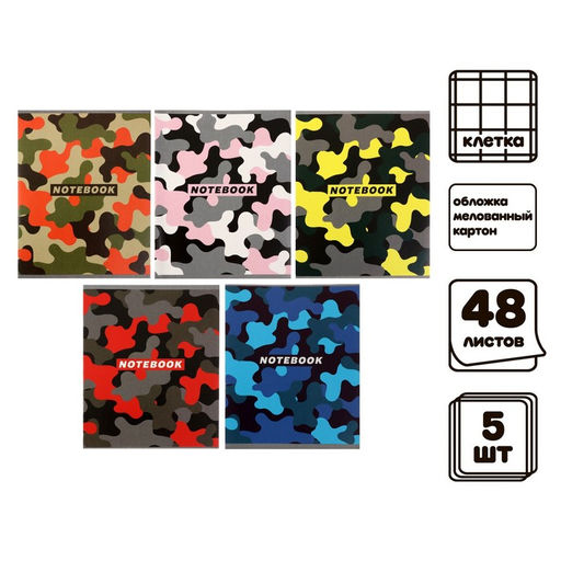 Комплект тетрадей из 5 шт, 48 листов, клетка, Цветной камуфляж, обложка мелованный картон, блок офсет