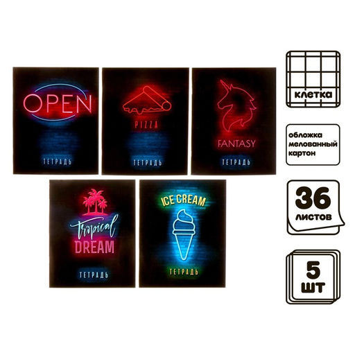 Комплект тетрадей из 5 шт, 36 листов, клетка, "Неон", обложка мелованный картон, блок офсет