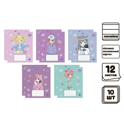 Комплект тетрадей из 10 штук, 12 листов в линейку "Аниме 013", обложка мелованный картон, ВД-лак, блок №2 (серые листы)