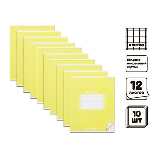Комплект тетрадей из 10 штук, тетрадь 12 листов в клетку Calligrata "Школьная", обложка мелованный картон, ВД-лак, блок офсет, белизна 95%, жёлтая