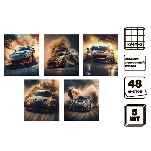 Комплект тетрадей из 5 штук, 48 листов в клетку Calligrata "АвтоDrift", обложка мелованный картон, ТВИН-лак + выборочный УФ-лак, блок офсет