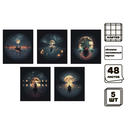 Комплект тетрадей из 5 штук, 48 листов в клетку Calligrata "Луна", обложка мелованный картон, ТВИН-лак, тиснение фольгой, блок офсет