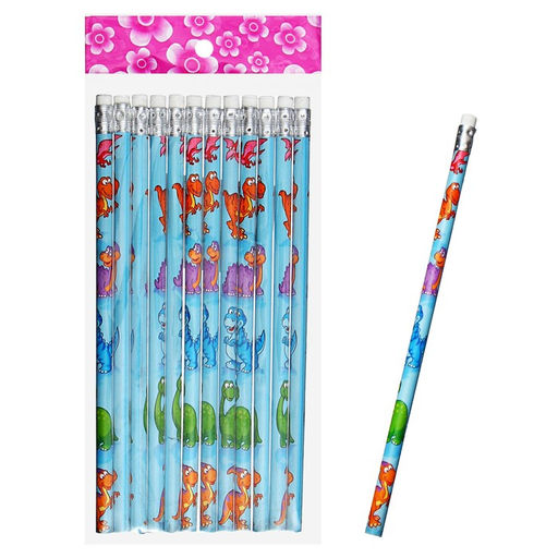 Цена за 12 шт. Карандаш чернографитный НВ с ластиком, корпус круглый, Динозаврики