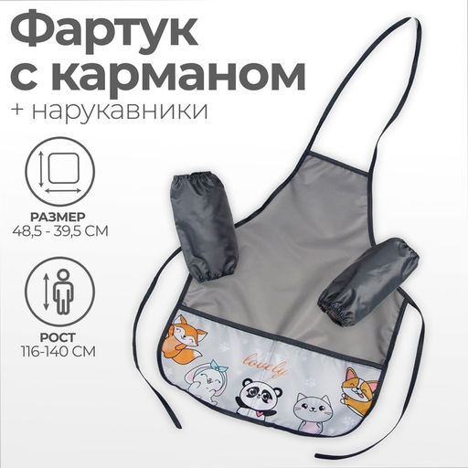 Фартук для труда + нарукавники, 485 х 395/250 х 160 мм, рост 116-146 см, Calligrata, "Зверята", серый
