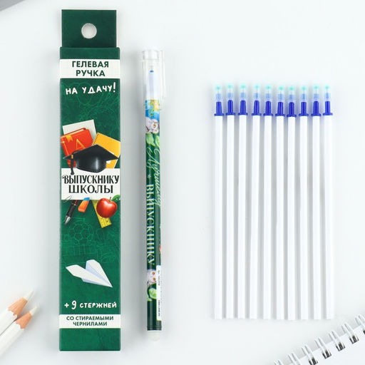 Набор ручка пластик пиши-стирай и 9 стержней Выпускнику школы, синяя паста, гелевая 0,5 мм