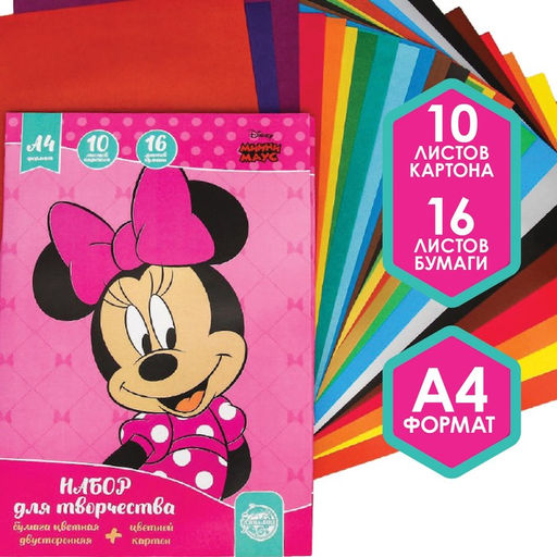 Набор "Минни Маус" А4: 10л цветного одностороннего картона + 16л цветной двусторонней бумаги