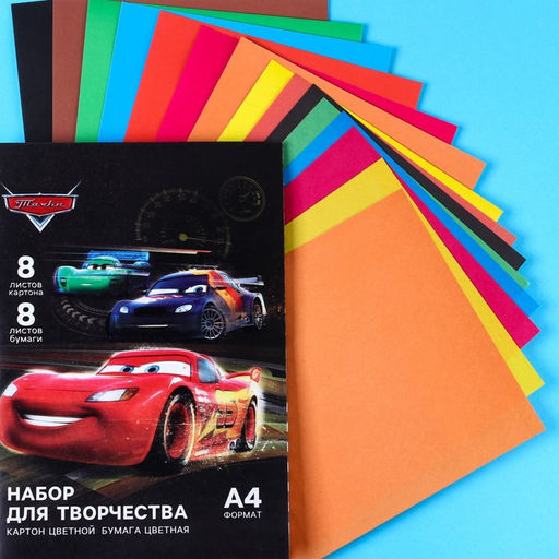 Набор Тачки А4: 8 л. цв. одност. мел. картона и 8 л. цв. двуст. бумаги, Тачки