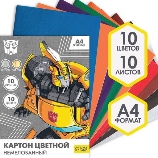Картон цветной немелованный, А4, 10 л. 10 цв., Transformers (серебро золото)