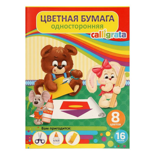 Бумага цветная А4, 16 листов, 8 цветов "Мишка и его друзья", газетная, на скобе