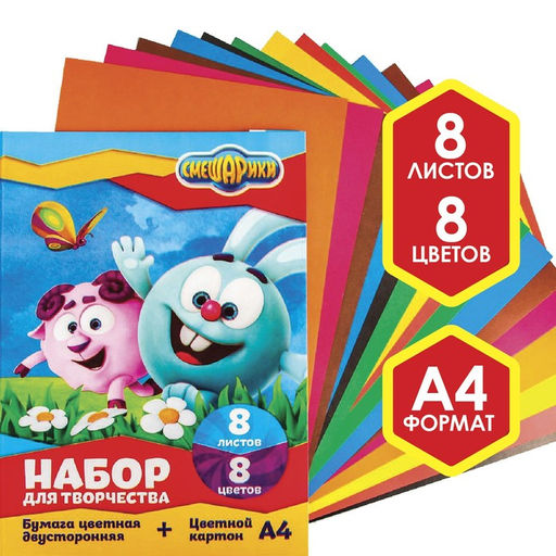 Набор "Смешарики" А4: 8л цветного одностороннего картона + 8л цветной двусторонней бумаги