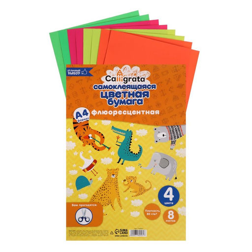 Бумага цветная самоклеящаяся А4, 8 листов, 4 цвета, флюоресцентная, 80 г/м2