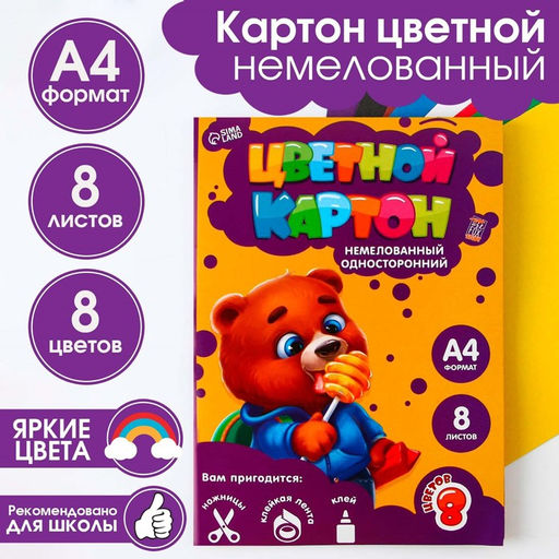 Картон цветной Медвежонок, формат А4, 8 листов, 8 цветов, немелованный односторонний, в папке, плотность 180 г/м.