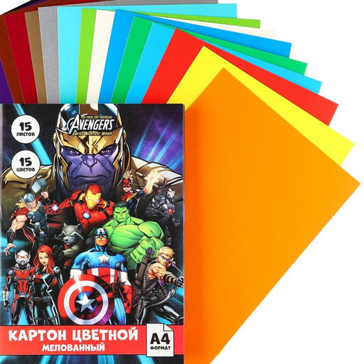 Картон цветной мелованный, А4, 15 л. 15 цв. (серебро золото), "Команда", Мстители