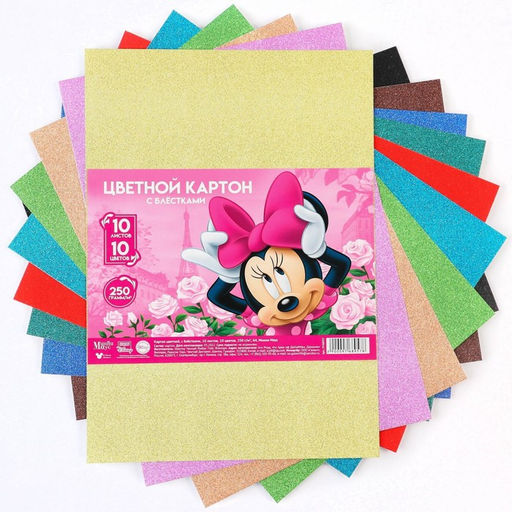Картон цветной, с блёстками, 10 листов, 10 цветов, 250 грамм, А4, Минни Маус