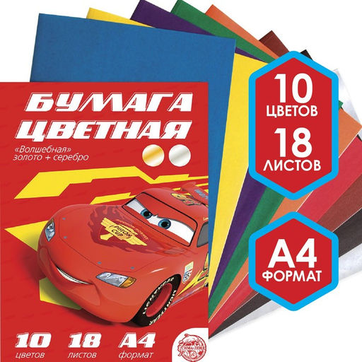 Бумага цветная односторонняя, А4 18 листов 10 цветов, золото и серебро, Тачки