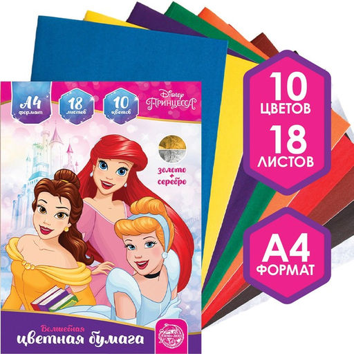 Бумага цветная односторонняя, А4 18 листов 10 цветов, Принцессы, золото и серебро