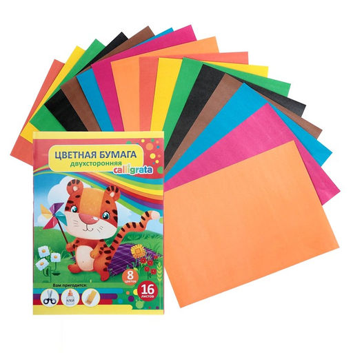 Бумага цветная А4, 16 листов, 8 цветов, газетная, двусторонняя, в папке