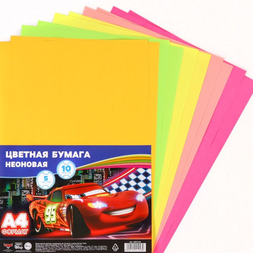 Бумага цветная неоновая, тонированная, А4, 10 листов, 5 цветов, 80 г/м2, Тачки