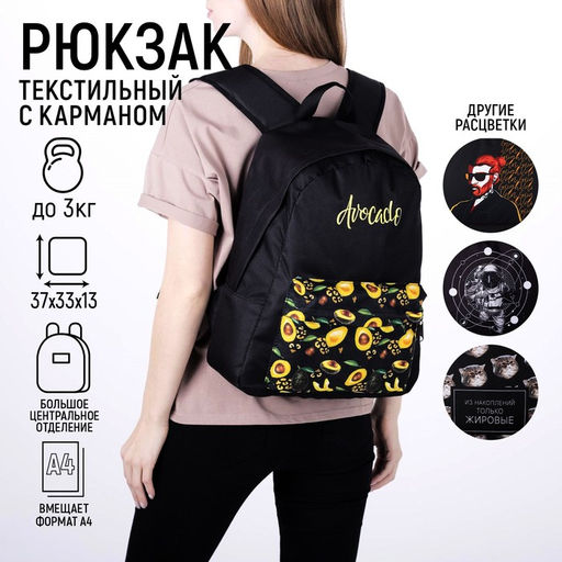 Рюкзак молодёжный Авокадо, 33х13х37 см, отд на молнии, н/карман, чёрный