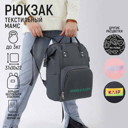 Рюкзак текстильный, с карманом ЖИВИ В КАЙФ,25х13х38, серый