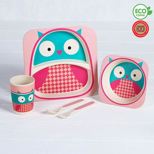 Набор детской посуды из бамбука Совушка, 5 предметов: тарелка, миска, стакан, столовые приборы