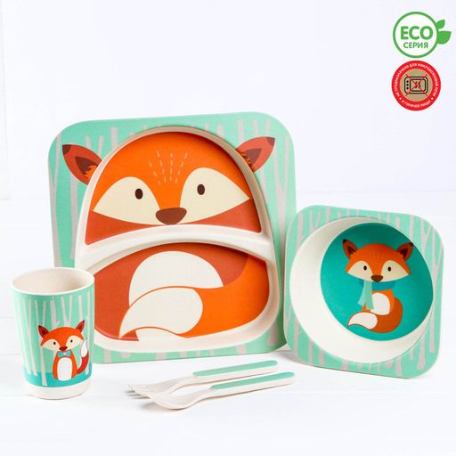 Набор детской посуды Лисичка, из бамбука, 5 предметов: тарелка, миска, стакан, столовые приборы