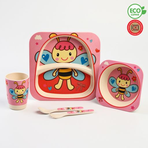 Набор бамбуковой посуды Бабочка, 5 предметов: тарелка, миска, стакан, вилка, ложка