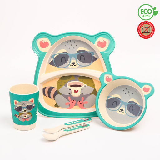 Набор детской бамбуковой посуды Енотик, тарелка, миска, стакан, приборы, 5 предметов