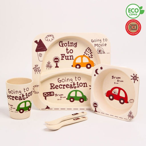 Набор бамбуковой посуды Машинки, тарелка, миска, стакан, приборы, 5 предметов