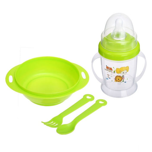 Набор детской посуды, 4 предмета: миска 200 мл, бутылочка для кормления 180 мл, ложка, вилка, цвета МИКС