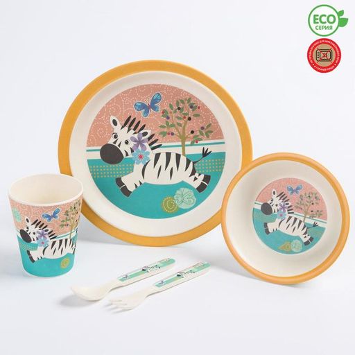Набор детской бамбуковой посуды Зебра, тарелка, миска, стакан, приборы, 5 предметов