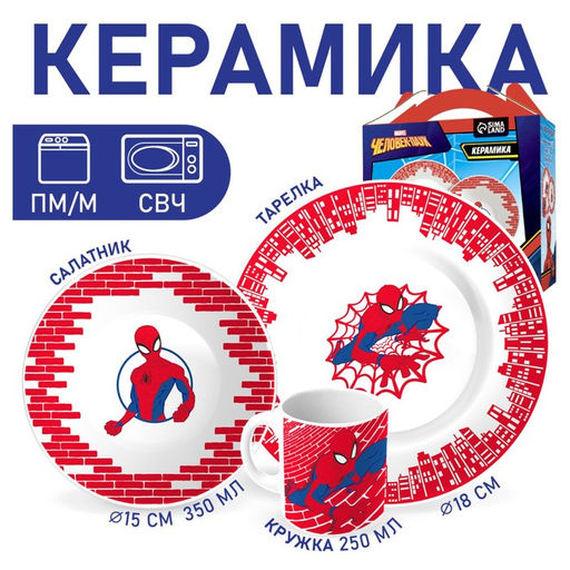Набор посуды, 3 предмета: тарелка 16,5 см, миска 14 см, кружка 200 мл, "Ты - супергерой", Человек-паук