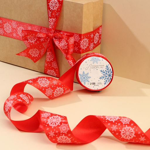Лента атласная Снежинки, красная, 4 см х 5 метров