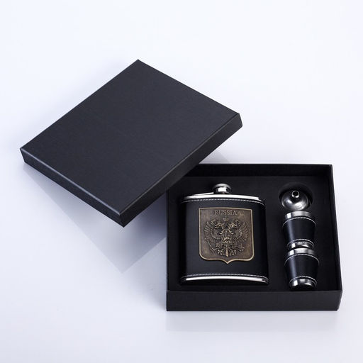 Подарочный набор 4 в 1 "Герб России": фляжка 210 мл, воронка, 2 рюмки, черный, 17 х 20 см