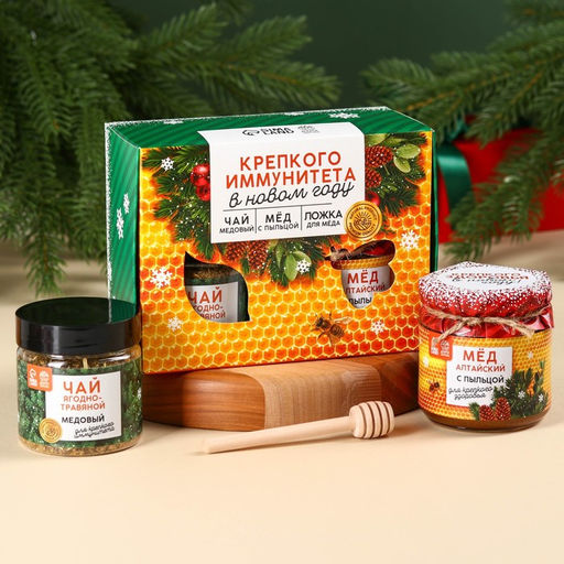 Подарочный набор Крепкого иммунитета: алтайский мёд с пыльцой 240 г., ягодно-травяной чай 50 г., ложка для мёда