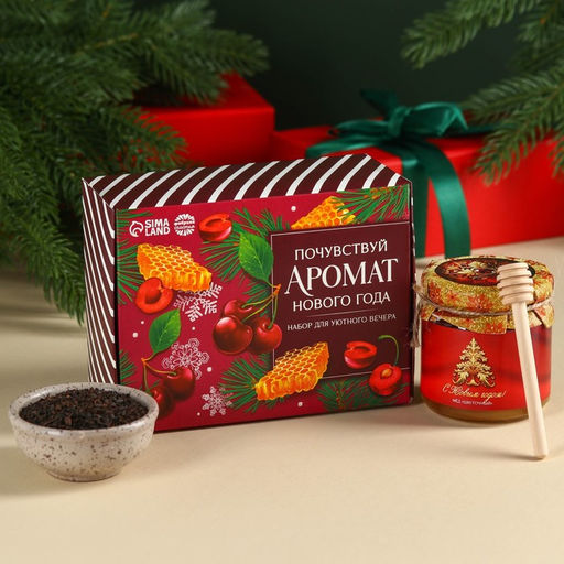 Подарочный набор Почувствуй аромат Нового года: чай чёрный со вкусом: зимняя вишня 50 г., мёд цветочный 240 г., ложка для мёда