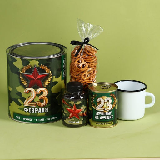 Подарочный набор "23 Февраля": чай чёрный 50 г., кружка 350 мл., арахис 100 г., крекеры 70 г.