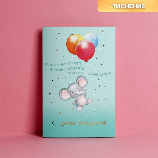 Цена за 10 шт. Открытка с тиснением С днём рождения, слонёнок на шариках, 12 х 18 см