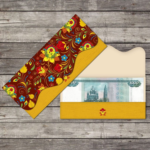 Цена за 10 шт. Конверт для денег формовой Русские узоры, яркие краски, 17,5 х 8 см