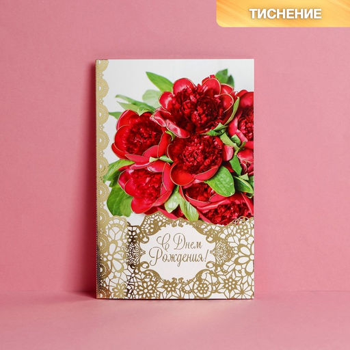 Цена за 10 шт. Открытка С Днем Рождения, бордовые пионы, тиснение, 12 18 см