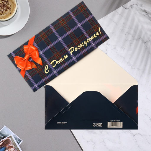 Цена за 10 шт. Конверт для денег "С Днём Рождения!" синяя клетка, 16,5х8 см