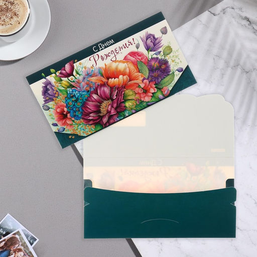 Цена за 10 шт. Конверт для денег "С Днём Рождения!" букет, синий тон, 18,5х8,5 см